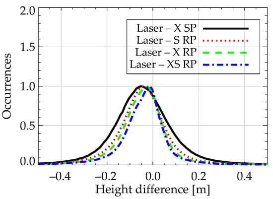 Figure 20 shows a zoom of around 1.5 km × 1.5 km located at the north-west portion of the image for the different SAR products: (top left) X-band SP, (top right) S-band RP, (bottom left) X-band RP and (bottom right) XS RP. As expected, the noise level improves from the single-pass DEM to the fused repeat-pass one. This can be also seen in Figure 21, which shows the normalized histogram of the differences between laser reference and SAR products for the region of interest. Note that the differences encompass not only noise, but also residual low-pass artifacts and topographic changes. Nevertheless, we obtain standard deviations of around 26 cm, 16 cm, 15 cm and 13 cm for the differences, attesting for the good quality of the SAR products.