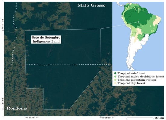 The Sete de Setembro Indigenous Land in true colors (Bands 2-3-4) on Sentinel-2 satellite images. Insert: the SSIL contextualized in its eco-region (from FAO 2010).