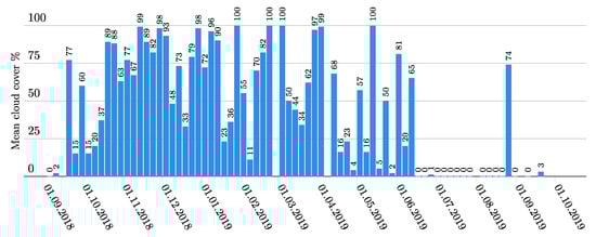 One year of data (05.09.2018 to 20.09.2019) was processed. During this time interval, out of 72 available scenes, 37 have a mean cloud cover of 50% or less and only 10 are completely cloud free (Figure 2). Such a yearly cloud cover percentage is representative for lowland tropical regions [].