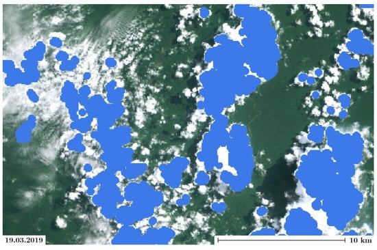 The Sentinel-2 data products are accompanied by a cloud-cover mask layer (band QA60, bitmask, Bit 10: opaque clouds, Bit 11: cirrus clouds) complemented by a mean cloud cover percentage given in the metadata of the granule []. However, as can be seen in Figure 3, the cloud mask fails to reliably identify the extent of the clouds and neglects their shadows entirely [,,].