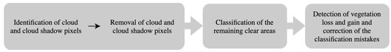 Our workflow allowed us to successfully remove cloud and cloud shadow pixels from analyzed images, thus significantly increasing the data density. The remaining pixels could be realistically classified and used in an automated vegetation loss and gain monitoring with a self-correcting function that led to the identification of a vegetation loss due to actual deforestation. This model can therefore constitute a powerful monitoring tool to assist in the prevention and assessment of deforestation and forest degradation. As all three steps of the strategy are separated, a more precise classification of the vegetation categories, which was outside the scope of this project, could be further improved in the future development of an ecoregion-specific monitoring system.
