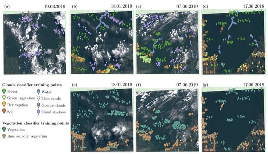 The training data for both classifiers were collected on the GEE by random visual pixel selection (Figure 5). No adjacent pixels were used and the distance between labelled points was at least 6 pixels. The four granules of the site were converted to a single image with the mean function, and all band values were converted to a range between 0 and 1. The previously described indices (i.e., NDVI, NDWI, EVI, CI) were added as bands. For the cloud and cloud shadow classifier, 2523 points were collected on four different scenes: Three cloudy scenes (18 January 2019, 19 March 2019, 7 June 2019) and one cloud-free scene (17 June 2019) (Figure 5a–d). The cloudy images were selected to be representative for both thin (i.e., cirrus) and opaque clouds. For the vegetation classifier, 1981 labelled points were collected on two cloudy scenes (18 January 2019, 7 June 2019) and a cloud-free scene (17 June 2019) (Figure 5e–g). The vegetation classifier has a binary output consisting of two classes: Vegetation and bare soil/dry vegetation. All labelled points’ feature collections were merged and sampled on their respective image. The two final collections thus obtained were randomized and attributed to training datasets (75%) or validation datasets (25%), and then exported to Google Drive in TFRecord format (an encoding format for binary records read by TensorFlow). The complete code can be found on Zenodo (https://doi.org/10.5281/zenodo.3766743).