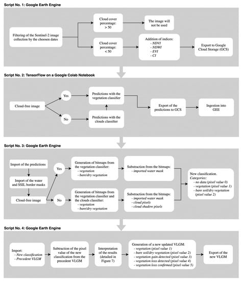 A workflow using the trained classifiers and consisting of four scripts (Figure 6), three running on GEE (JavaScript) and one running on a Google Colab notebook using TensorFlow and Keras libraries (Python), was implemented and applied to one year of data (5 September 2018–20 September 2019).