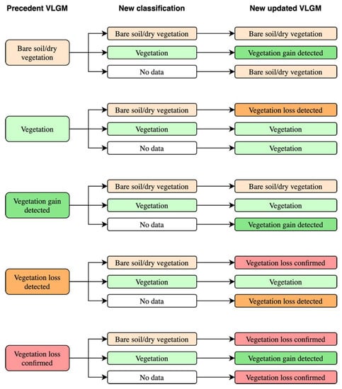 The fourth and final script (JavaScript, GEE) used the classified image in order to create a dynamically updated vegetation loss and gain map (VLGM) comprising the categories Bare soil/dry vegetation, Vegetation, Vegetation loss detected, Vegetation loss confirmed, and New vegetation detected and corrected for detection errors. In order to be confirmed, a loss or gain had to be detected twice in a row (Figure 7). If no data were available in the subsequent image classification, for example, because the area was covered by clouds, the detected status was maintained instead of being confirmed or discarded.