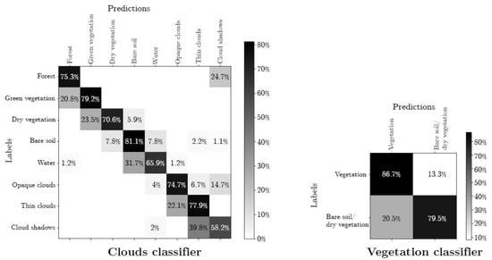 The confusion matrices produced with the models’ predictions showed that 60% to 85% of the pixels were correctly classified (Figure 8). The clouds and the cirrus were almost only misclassified as each other and as shadows, which is acceptable for the desired use of the model as the categories were later merged into a single mask. Once merged into a single category, the misclassified clouds and cloud shadow pixels dropped to <5%. Pixels corresponding to forest landcover were classified as shadows 25% of the time, presumably when they were darker due to self-shading or the topography. The vegetation and bare soil/dry vegetation classifier correctly classified 86.7% of the forest pixels and 79.5% of the bare soil/dry vegetation pixels. Soil/dry vegetation was misclassified as forest 20.5% of the time. The overall accuracy for both models is >0.95 for the training and validation data.
