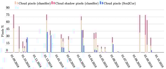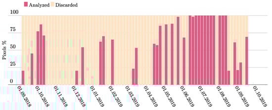 The use of a cloud and cloud shadow classifier allowed the inclusion of images with a cloud cover percentage up to 50%, which considerably increased the temporal resolution from 10 (clear images exclusively) to 37 images (50% cloud cover or less) over one year. The percentages of pixels that could be used for analysis over the whole dataset are shown in Figure 11.