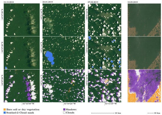 The imagery produced by the Copernicus Sentinel-2 mission, a twin optical remote sensing satellite constellation characterized by high spatial, temporal, and spectral resolutions, has been increasingly employed for landcover monitoring applications since its launch by the European Space Agency (ESA) in 2015, e.g., [,], as it offers a higher temporal and spatial resolution relative to Landsat missions. One common challenge in the use of optical satellite imagery in lowland tropical regions is the ubiquity of high cloud cover percentages, which cause an important signal perturbation and can prevent spectral analysis entirely [,]. Moreover, as high (>30%) to complete (100%) cloud cover follows a seasonal distribution (October to May), it can completely preclude monitoring during large fractions of the year. The Sentinel-2 data are provided with a cloud mask; however, its identification of cloudy pixels is insufficiently reliable and cloud shadow pixels are not identified at all [,,]. Because cloud and cloud shadow detection is an essential step in the analysis of optical remote sensing data, many detection schemes have been developed in the past. Multiple algorithms are currently implemented to detected cloud and cloud shadow pixels, using either single acquisition data or time series. Three commonly used algorithms are MAJA [], Fmask [], and Sen2Cor []. All three algorithms use either static or dynamic threshold values for different spectral bands dedicated to the separate detection of clouds, cirrus (or thin clouds), and cloud shadows. This type of detection strategy shows good results for thick clouds but is less efficient for cirrus detection and for the detection of cloud edges []. The MAJA algorithm uses a multi-temporal method to detect cloudy pixels by assuming that landcover changes slowly and therefore a sudden increase in reflectance indicates the presence of clouds. As it is a recurrent method, it is less reliable in regions where cloud cover is persistent, such as in lowland tropical regions, as the most recent cloud-free pixel may be too old to be used to detect clouds []. The Fmask algorithm was originally developed for masking cloud, cloud shadow, and snow pixels for Landsat 4–7 and was extended to Landsat 8 [,]. A variant was later developed for Sentinel-2 data, even though the original algorithm uses the thermal infra-red channels (TIR), which are not present in Sentinel-2 [,]. Fmask performs similarly to MAJA overall [] but better in tropical regions []. Sen2Cor is the algorithm currently used by ESA to provide a cloud mask for the Sentinel-2 imagery. While its overall accuracy has been estimated to be 84% [], its performance over Amazonian rainforest has been shown to be poor, with local occurrences of omission errors of >70% []. Commonly used algorithms can show good performances; however, their application to tropical regions remains a challenge due not only to the high frequency of important cloud cover but also to cloud formation processes specific to tropical forest regions [,].