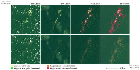 The vegetation loss and gain detection system (Figure 12 and Figure 13) allows a dynamic interpretation of the time series and updates all categories, including the areas previously classified as Bare soil or Vegetation loss confirmed where new vegetation was detected, which limits the accumulation of outdated information over time. It also accounts for the evolution of the low vegetation areas (pastures, croplands) over the seasons. On the 23 January 2019 image, new vegetation starts to appear and is identified by the model (green area on the left-hand side of the image). On the 28 April 2019, the vegetation gain has been confirmed and removed from the map. Indeed, on the true color image in the top part, the vegetation is visibly healthy. On the 2 July 2019 image, senescence and drying-out of the vegetation started occurring again—vegetation loss, in red, has been confirmed. A new vegetation loss area, on the right-hand side, has been detected and partially confirmed as well. On the 11 August 2019 image, the vegetation loss has visibly progressed both on the right- and left-hand sides of the image.