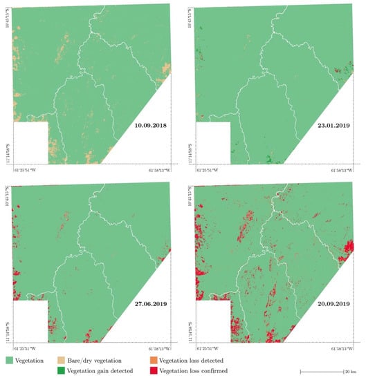 In its present state, the model is able to identify vegetation loss and gain while reliably filtering out cloud and cloud shadow pixels. The vegetation detection efficiently distinguishes forest from bare soil and senescence-prone biomass, such as cattle pastures, shrubs, or plantations. Moreover, it provides an efficient false positive detection system, which prevents the accumulation of detection errors over time. Owing to its coupled vegetation/cloud and shadow detection systems, useful information can be extracted not only from cloud-free scenes but also from images with a high cloud cover percentage, which, combined to the use of the short revisit time of the Sentinel-2 mission, allows for a high temporal resolution. This is especially valuable in lowland tropical regions, where optical satellite imagery is vulnerable to excessive cloud cover. The threshold value of 50% is indicative and could be selectively increased when areas of interest, such as known vulnerable zones, are clear, even when the rest of the scene is not. Because of the precision of the outline of detected clouds, areas in the holes of the clouds could be included as well (Figure 10). The comparison system provided a time series showing the evolution of the vegetation over time. Outdated information, e.g., previously bare areas reclaimed by vegetation growth, were removed from the map through the correction mechanism while newly bared or dried-out surfaces were signaled. This allowed the observation of a distinct trend in the vegetation loss and gain even during the cloudy winter months. In September 2019, a realistic increase in vegetation loss compared to September 2018 could be observed.