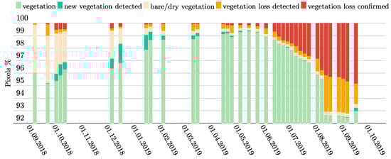 The evolution of the vegetation on the SSIL throughout one year (September 2018–September 2019) can be seen in Figure 13 and Figure 14. At time zero of the monitoring, about 96% of the SSIL was covered by forest and green vegetation, while 4% was covered by other types of surfaces (bare soil, dry vegetation, settlements) (Figure 14). During the wet winter season, although regular observation of the landcover was hindered by the frequent occurrence of cloud covers superior to 50%, a trend is distinctly visible. The green vegetation cover expands, reaching more than 99% in May 2019. From June 2019 onwards, the percentage of dry and bare areas started increasing again until reaching values comparable to the previous year. During August 2019 and the first part of September 2019, a very high percentage of detected but unconfirmed bare/dry vegetation appeared due to the interference of forest fire smoke. On the last analyzed image, this category decreases again due to the availability of clearer images. In mid-September 2019, at the end of the monitored period, the area covered by confirmed bare soil/dry land increased by more than 0.5% compared to mid-September 2018. This excess loss of vegetation was confirmed and attributed to a localized deforestation event by a Suruì representative (February 2020, personal communication).