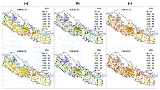 Figure 6 illustrates the spatial distributions of the POD, FAR and ACC values in the four SBP datasets at each station across the country. These values were calculated based on daily precipitation data. POD is above 70% at most of the stations in GSMaP-Gauge, followed by 40–80% in IMERG product, and 40–60% in GSMaP-MVK. Therefore, the daily gauge-calibrated GSMaP-Gauge outperformed the other three datasets to detect gauge precipitation events. It is worth noting that POD is higher in GSMaP-Gauge compared to GSMaP-MVK, while similar performances are found in both IMERG datasets. The GSMaP-Gauge datasets were calibrated based on daily scale NOAA/CPC data; therefore, both the amount and the occurrence were corrected, while IMERG-C datasets were corrected based on monthly scale GPCC data, thus only the precipitation amounts were adjusted. This may be the reason for similar POD performance in two IMERG products. All four datasets showed similar FAR distributions, with the best performance in mid-elevation areas and poor performance in high-elevation areas, revealing that the error was lower when the precipitation amount was higher. ACC exceeded 70% in all four SBP datasets at most of the selected stations across the country (Figure 6).