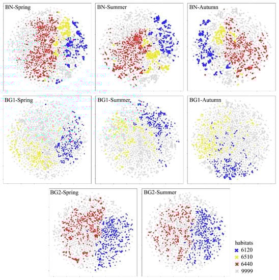 In this study, t-SNE algorithm was used to evaluate if reference polygons were correctly assigned to the belonging habitat class [85]. A series of iterative visualizations, with perplexity hyper-parameter varying between 5 and 130, were performed. PCA-based initialization was used to provide stable global layouts. Figure 4 presents the t-SNE plots using a perplexity value of 30 and after removal of detected incorrect points, for all areas and acquisitions analyzed. It depicts the real spectral characteristics of the investigated habitats. Habitats 6120 and 6440 are clearly clustered and it seems that they hold quite different spectral characteristics among both BN and BG2 areas. Instead, habitat 6510 seems slightly more mixed with other classes, being in-between habitats 6120 and 6440 in BN-related plots. However, if we compare habitat 6510 only to habitat 6120 in BG1-related plots, it seems they have more clear differences. Over all plots, the background class (code 9999) is the one having the highest heterogenous spectral characteristics.