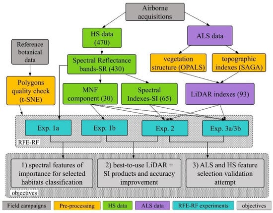 Airborne flight campaigns with HS and LiDAR sensors were conducted simultaneously to botanical field-surveys three times in the growing seasons (Spring/Summer/Autumn), along three significative river valleys in Poland, with a good distribution of lowland meadows and dry grasslands habitats, as described in Section 3.1. With the aim of combining the RFE method with RF classification, an RFE-RF automated classification system was developed and is described in Section 3.4. Three different experiments were designed in line with the objectives of this paper, as described in Section 3.5. In the first one, we aimed at identifying the relevant spectral features for meadows and dry grasslands mapping, by applying the RFE on the hyperspectral dataset alone and comparing results with a standard, well-known dimensionality reduction technique, the minimum noise fraction transformation (MNF) [69,70,71,72]. The most effective method for hyperspectral dimensionality reduction was then retained for the second experiment, in which several spectral- and topographical-based metrics were computed and added to the RFE-RF classification system. Using the RFE technique, we derived for each case study, a list of optimal features selection which might represent the best-to-use features for the investigated classification problem. In the third experiment, as a sort of verification test, only the best-to-use selected features were used to run the final classification maps. In this way, we could attempt to generalize a best-to-use features selection to be calculated from ALS and HS data respectively, for the classification of the selected Natura 2000 grasslands (6440, 6510 and 6120) in the analyzed river valleys.