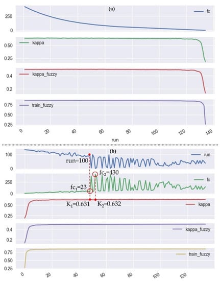 When the RFE option is used in the VCS software, an RFE report is produced in the results (Figure 6). This is employed in the next step for the definition of the optimal feature selection to be chosen as the best-to-use feature configuration out of the multiple run sequences, generally being the one having the best compromise in terms of higher Kappa and lower number of features. Figure 6a illustrates the different classification results sorted by classification run sequences (on the x-axis). If the same results are sorted by the Kappa values (Figure 6b), it is possible to locate the point where a major increase in the number of features (green line, fc) will not cause a major change in the Kappa results. In this example, run 100 produced a Kappa of 0.631 using 23 features, while a similar Kappa value of 0.632 was obtained using 430 features. Therefore, run 100 can be retained as the optimal feature selection because by using a much lower number of features a very similar Kappa accuracy can be achieved.