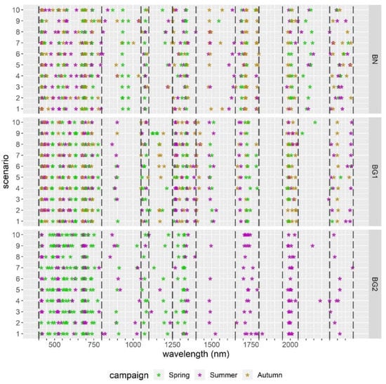 The best-to-use spectral channels selected by the RFE technique (based on the approach described in Section 3.4) when classifying the 430 SR bands (Exp. 1a) are plotted in Figure 7, for each study area and for each acquisition campaign (different colors). The results show that the mostly used spectral channels belong to the following spectral ranges:
