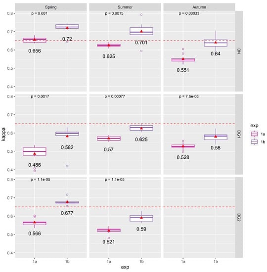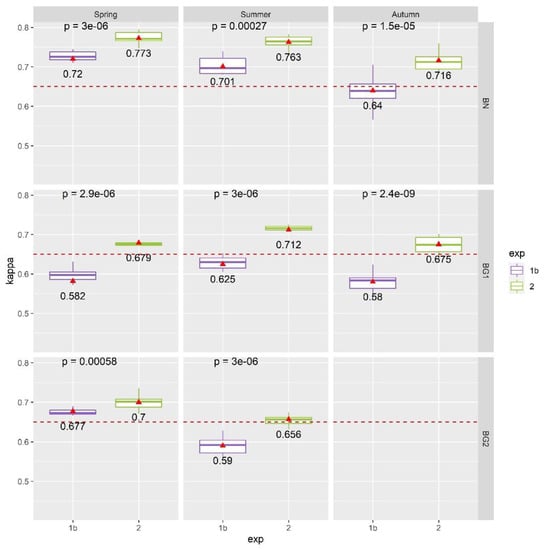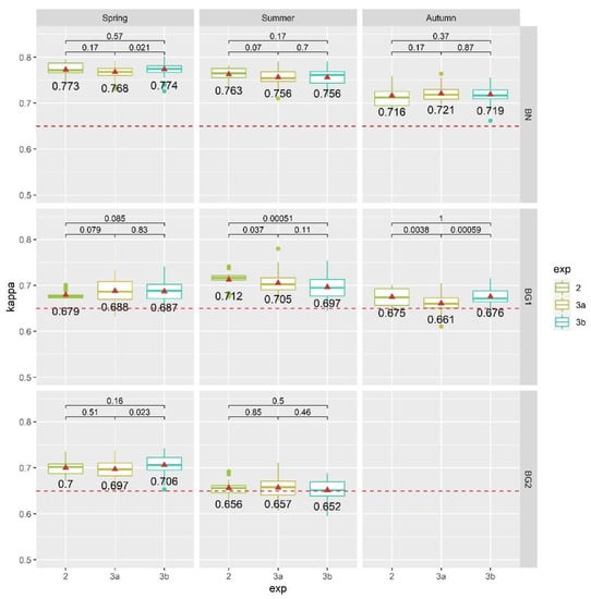 For each of the ten RF classification runs (scenario 1-10, as explained in Table 2), the Kappa accuracies obtained by the optimal features selection after applying the RFE (Exp. 1a) are plotted in Figure 8 against the Kappa accuracies obtained by classifying the 30 MNF components alone (Exp. 1b). The ƿ-value resulting from the “Wilcoxon signed-rank test” [95] are also plotted. A ƿ-value less than 0.01 (typically ≤ 0.01) indicates that there is a statistically significant difference between the two results, while on the contrary for a ƿ-value higher than 0.01, there is not a statistically significant difference [96]. If we compare all results, we can observe that in all cases the MNF results outperform the RFE results, with statistically significant difference. For example, for the BN spring acquisition, the MNF results (Exp. 1b) have a mean Kappa of 0.72, while the RFE results (Exp. 1a) have a mean Kappa of 0.656. As another example, for the BG2 summer acquisition, the MNF results have a Kappa of 0.59, while the RFE results have a Kappa of 0.521. For this reason, the 30 MNF components were retained for further processing and Exp. 2 was run by adding all others input features (93 LiDAR-products and 65 SI) to the 30 MNF components, as described in Section 3.5.2 and Figure 4.