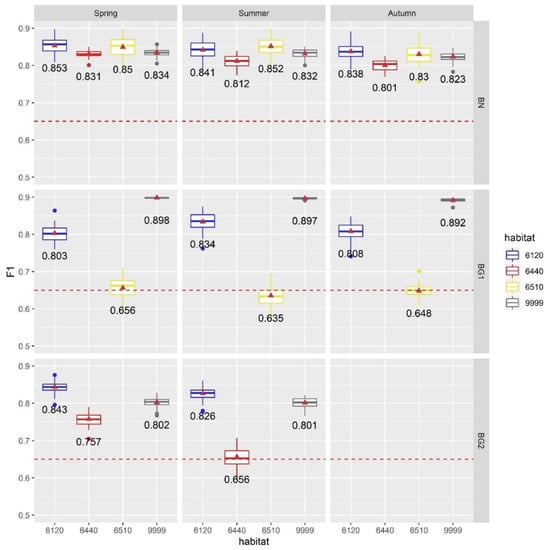 The final numbers of reference polygons, obtained after the quality assessment and used for classification, are shown in Table 1 for each habitat and study area analyzed. The higher number of background polygons (class 9999) is justified by the large acquisition areas (such as BG1) and therefore by the much higher spatial distribution of heterogeneous non-habitat classes.