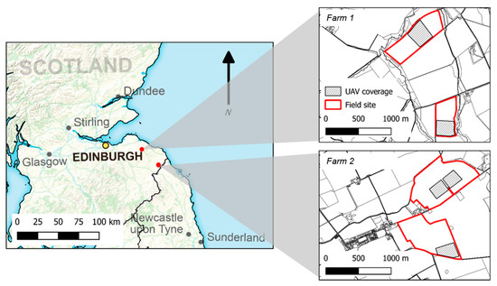 Locations of two farms (red dots) and map insets highlighting the field sites (red border) and within-field areas of interest (black cross-hatching) where field campaign data, including ground measurement and UAV surveys, were carried out.