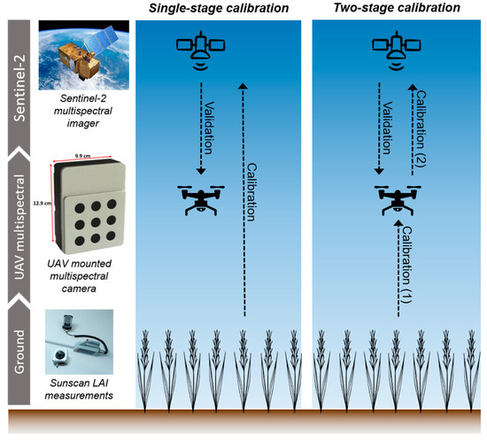 Thus, recent research has aimed to use UAV sensors to bridge this scaling gap between ground and EO data, including the calibration of EO-derived VIs using UAVs (e.g., [38,42]). However, there has been a scarcity of studies that have applied a UAV calibration to retrieve measurable biophysical parameters describing the crop canopy, such as LAI. Another weakness in these past studies is that UAV sensors have measured different spectra to the satellite. UAV sensors should have the same spectral bands to those of satellite-based sensors for robust scaling studies [43].