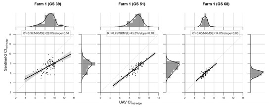 When comparing between the CIred-edge values derived from the Sentinel-2 and UAV imagery, we found that the correlation between the values from the two platforms generally increased as crop growth stage advanced. During early phenological periods, it is likely that the influence of bare soil on the reflectance spectra would have been greater, with the wheat canopy being highly heterogeneous across the field. In particular, the earlier growth stages noted for both farms (i.e., growth stages 31 and 39) correspond to the start of significant periods of canopy development, including stem elongation and the development of yield-forming leaves [11]. During this stage, when both crop ground cover and fractional light interception increase linearly with LAI [55], farmers target their main applications of nitrogen fertiliser. When compared to the relatively coarse-scale (20 m) Sentinel-2 observations, the 5-cm spatial resolution of the UAV dataset was sufficient to resolve these small discontinuities in the canopy. The distribution of values across the field was also much narrower for Sentinel-2 when compared to that of the UAV, further suggesting that these variations in canopy cover were not detected by the satellite sensor.