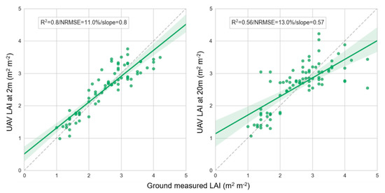 Scatter plot comparisons between LAI retrieval models calibrated with UAV multispectral data aggregated at 2 m (left) and aggregated to a 20 × 20 m square grid cell (right). Both calibration approaches are compared to LAI ground measurements acquired at 80 locations. Plot includes a liner fit line (solid green line) with 68% confidence interval (shaded green area). The dashed gray line represents the 1:1 line.