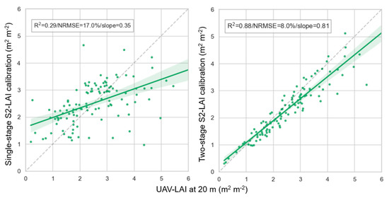Independent validation of Sentinel-2 LAI (S2-LAI) to UAV spatially aggregated (20 m) LAI estimates (UAV-LAI). S2-LAI include estimates from a direct single-stage LAI retrieval calibration using ground data (left) and a two-stage calibration using the spatially up-scaled (20 m) UAV LAI estimates (right). Dashed gray line represents the 1:1 line.