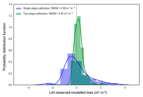 The observed–estimated LAI bias values in the distribution for the single-stage calibration were broader and slightly positively skewed when compared to that of the two-stage calibration (Figure 7) when using the same independent calibration/validation datasets. The two-stage calibration bias had a narrower and more symmetrical distribution. The single-stage calibration has a mean LAI error of 1.0, compared to 0.45 for the two-stage process. Furthermore, the single-stage approach produces very poorly constrained estimates in some cases, shown by the long tails of the error distribution.