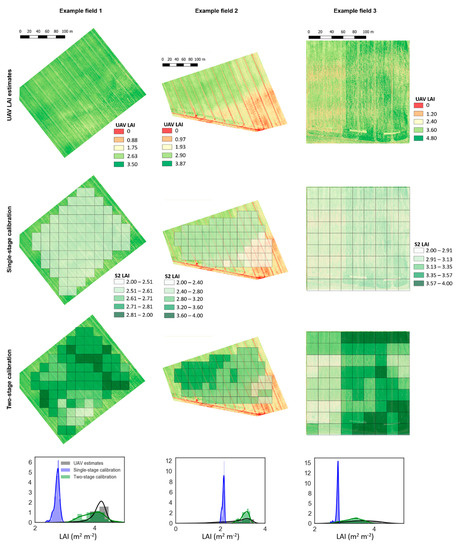 The Sentinel-2 two-stage calibration was capable of resolving the within-field spatial variability in LAI, whereas the single-stage calibration only captured less than half of this variability. We compared LAI maps of sample fields derived from the different calibration approaches to that from the fine-scale UAV LAI estimates (Figure 8). The variability captured by the two-stage approach was visually comparable to the fine-scale UAV LAI estimates. In particular, the two-stage approach better resolves areas of high and low LAI. The single-stage calibration, on the other hand, appeared to underestimate LAI at higher values.
