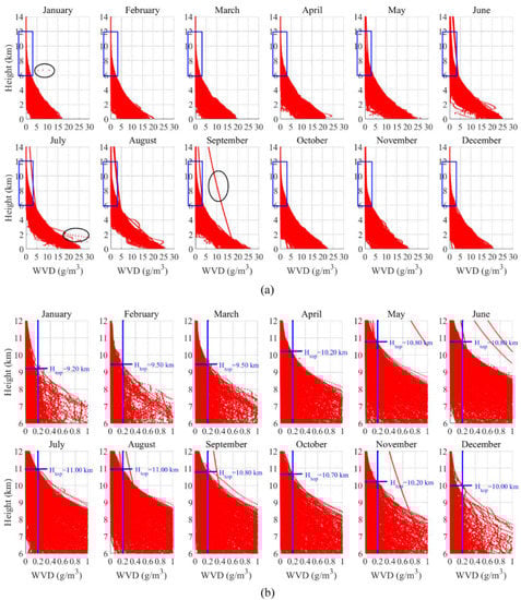 The distribution of water vapor derived from 30 years of radiosonde data in the atmosphere for different months. (a) The vertical distribution of atmospheric water vapor. The black ellipse in (a) represents the outliers; (b) enlarged view corresponding to the blue rectangle in (a). Blue vertical lines in (b) correspond to the principle that the water vapor density (WVD) is 0.2 g/m3, and the blue horizontal lines denote the optimal top boundary during different months.