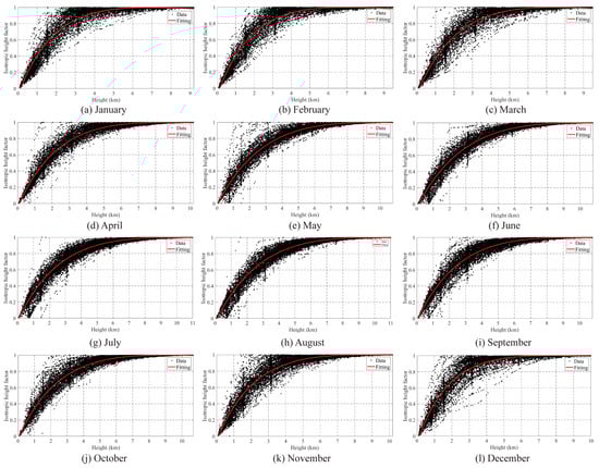 Figure 3. The isotropic height factor changes with height in different months. (a) January; (b) February; (c) March; (d) April; (e) May; (f) June; (g) July; (h) August; (i) September; (j) October; (k) November; and (l) December. - The function relationship between the and . In view of the variety of atmospheric water vapor, owing to the fact that the radiosonde balloon in Hong Kong is launched twice a day, at 00:00 UTC and 12:00 UTC, the radiosonde data cannot provide sufficient observations for daily-scale analysis. In addition, according to the periodic characteristics of ZTD and precipitable water vapor (PWV) [,], the relationship between the isotropic height factor and the height using 30 years of radiosonde data from 12 months is presented in Figure 3. Besides, the long-term trends of the isotropic height factor will not have an important impact on the tomography results. On the other hand, the wet refractivity water vapor decreases exponentially with height in the troposphere, and it is found from Equation (7) that the isotropic height factor is related to the wet refractivity in the zenith direction. In the work of Yao and Zhao [], Zhao et al. [], and Zhao et al. [], a similar scale factor or truncation factor is introduced, the trend of which changes with the height, as analyzed based on the exponential relationship in all three studies.