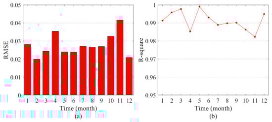 The (a) root mean square error (RMSE) and (b) R-square of the least-squares fitting results of different months.