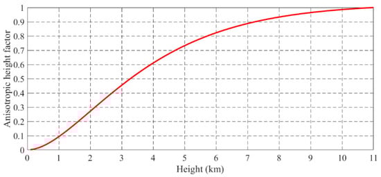 where and represent the height of the zenith projection of the slant path and along the zenith, respectively. During the tomography periods in Hong Kong in August 2017, the tomography top boundary was determined to be 11 km from Figure 1, and was set to 2 km, according to the ground meteorological data in Hong Kong. Therefore, the anisotropic height factor only has a functional relationship with height . For instance, increases equidistantly from 0 to 11 km with the interval of 0.1 km, and the corresponding could be calculated by Equation (15). With the sample data of and , the red curve in Figure 5 could be drawn.
