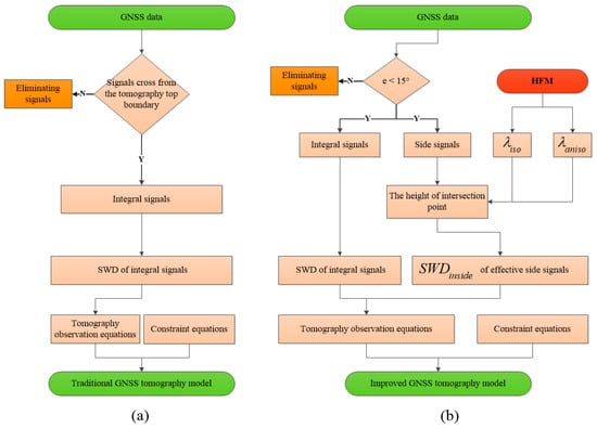 In common GNSS tomographic models, only GNSS signals passed from the top boundary are considered as effective observations for the tomographic model []. In this section, an improved GNSS tomography algorithm based on HFM is introduced, as shown in Figure 6. The process of GNSS tomography equations using integral signals and inside signals is discussed, respectively. The horizontal and vertical constraints are also described in detail.