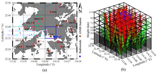 (a) Plane map of the Hong Kong area obtained by Mercator projection with 17 Global Navigation Satellite System (GNSS) reference stations (red dots) and radiosonde King’s Park Meteorological Station (HKKP) (blue dot) in Hong Kong; (b) 3-D distribution of GPS signals for the proposed tomography model. Red lines represent signals passing from the top boundary of the tomographic area, whereas green lines denote rays penetrating from the side face of the tomography region. The blue vertical columns represent the radiosonde (RS)-voxels where the radiosonde is located.