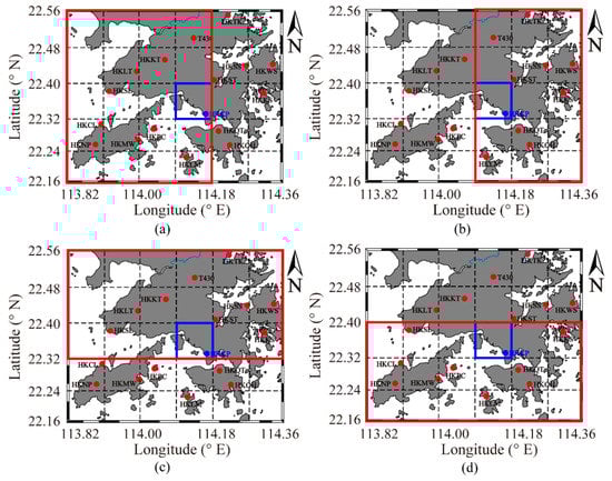 In the most common voxel-based tomography model, to assess the accuracy of tomographic results, water vapor profiles of the voxel columns (small blue rectangles in Figure 7b) where the radiosonde is located are compared with radiosonde-derived vertical profiles. However, the empty voxels are mainly distributed on the side of the three-dimensional tomographic model. Consequently, as shown in Figure 8, four special test schemes based on four different tomography areas (red boxes of Figure 8a–d) were implemented. The RS-voxels (the blue voxels, shown in Figure 7b, where the radiosonde is located) were placed on four boundaries of the tomographic region in the four schemes, for instance, RS-voxels on the east side (Figure 8a), RS-voxels on the west side (Figure 8b), RS-voxels on the south side (Figure 8c), and RS-voxels on the north side (Figure 8d). Table 2 shows the accurate range of the tomographic area and the number of voxels in these four schemes.