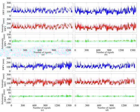 The isotropic and anisotropic SWV values of inside signals were first estimated by the HFM, as listed in Figure 9. A slight consistency between the total SWV and the isotropic one can be noticed from the four sub-figures. In contrast, the anisotropic parts were inconsistent with the totals and only accounted for an average of 2.31%, 2.56%, 2.61%, and 2.25% of the corresponding total component in the four schemes, which reveals that the isotropic portion has a more marked significance than the anisotropic portion in estimating the SWV value of the inside signals. However, the latter, with a value of approximately 20 mm for certain rays, is also important.