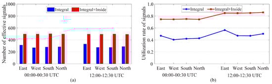 The average number of effective signals (a) and the mean utilization rate of signals (b) for the two methods during the period of DOY 213-243, 2017.