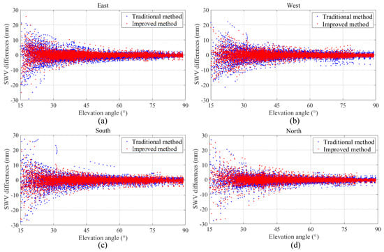 The three-dimensional WVD was reconstructed using the traditional method and the proposed approach, respectively. To assess the retrieval capabilities of the optimized tomographic model, the SWV differences between the observed SWV and reconstructed SWV from the three-dimensional tomographic water vapor field were calculated, and the SWV differences between the traditional method and the proposed approach were obtained, respectively. Figure 12 illustrates a comparison of the SWV differences between the two methods in the four schemes.