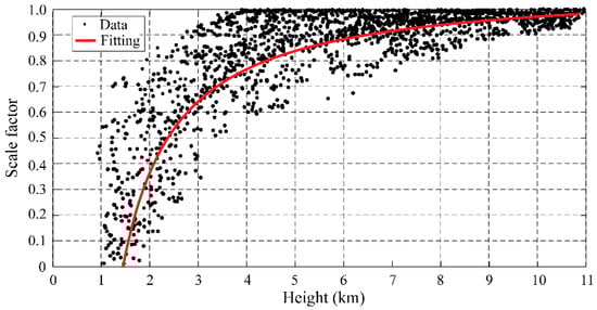Based on GNSS data at two tomography epochs of 00:00-00:30 UTC and 12:00-12:30 UTC during the period of DOY 213-243, 2017, the scale factor in the Yao model was calculated and is illustrated in Figure 13, where a similar exponential relationship can be observed. It is noticeable that owing to the neglection of GNSS signals with an elevation angle of less than 15°, all of the heights of the intersection points are higher than approximately 1 km. Accordingly, the coefficients and were estimated by the least-squares method, and the results are given in Table 5 [].