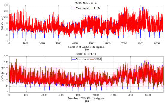 With the scale factor in the Yao model and the HFM proposed in this paper, the SWV of the side signals could be estimated based on the height of the intersection points. Consequently, Figure 14 presents a comparison of the SWV value of effective side rays between the Yao model and HFM at two tomography epochs during each of the test days. It is clear that the HFM can estimate slightly higher SWV values than the Yao model for most signals, and the latter provides a rather small SWV estimation, with a value of approximately 20 mm, for several observation rays.