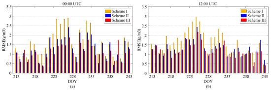 Comparisons of the RMSE of the tomography results derived from different schemes during the 31-day period from DOY 213 to DOY 243, 2017, at (a) 00:00 UTC and (b) 12:00 UTC daily.