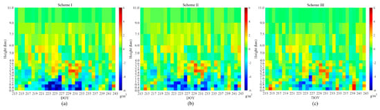 To assess the water vapor reconstruction capabilities of different methods, the tomographic results derived from the three schemes, described in Figure 15, were employed to illustrate the water vapor vertical profile at 00:00 UTC and 12:00 UTC on DOY 220 (sunny day) and DOY 234 (rainy day).