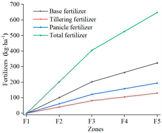 A 1500 m2 (30 m × 50 m) paddy rice field (Figure 1a) (variety: ‘Meixiang zhan’) in the Ningxi Teaching and Research Bases (NTRB) at the South China Agricultural University, Guangzhou, China (23°14’22” N, 113°38’31” E), was selected for the survey. Plant spacing and row spacing in the field were both 0.2 m. The rice field was divided into five comparison zones: F1, F2, F3, F4 and F5. Each zone consisted of three fields, F1: A1, B1 and C1; F2: A2, B2 and C2; F3: A3, B3 and C3; F4: A4, B4 and C4; F5: A5, B5 and C5 (Figure 1b). The size of each field was 10 m×10 m. Additionally, five zones were fertilized with different nitrogen application rates (Figure 2). It should be noted that the fields of each comparison zone were treated with the same fertilization strategy. This strategy involved applying different amounts of base fertilizer, tillering fertilizer and panicle fertilizer to create differences in crop growth.