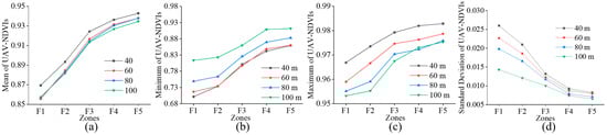 Mean (a), minimum (b), maximum (c) and standard deviation values (d) of the UAV–NDVIs of the five zones (F1–F5) at different flight altitudes.