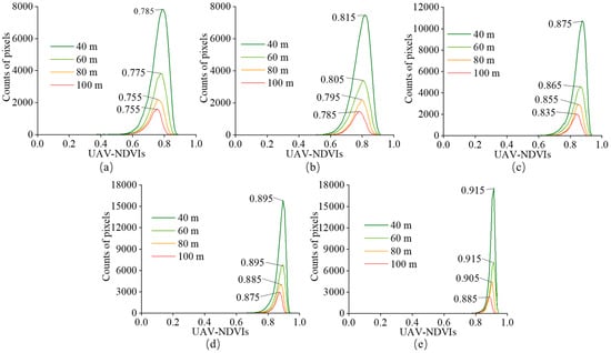 In order to further analyze the COP differences of the UAV–NDVIs in the field-scale, the COP distribution curves of the UAV–NDVIs were analyzed under different FAs for fields B1–B5 (Figure 6). It could be seen that, on the whole, the higher the FA, the lower the COP, the smaller the NDVI value of the peak COP and the smaller the NDVI value overall. For instance, in B1 (Figure 6a), the peak COP NDVI values were 0.785, 0.775, 0.755 and 0.755 for 40 m, 60 m, 80 m, 100 m, respectively, and the COPs of these peak NDVI values were 7820, 3808, 2162 and 1596, respectively. The mean UAV–NDVIs of the FAs from 40 m to 100 m were 0.766, 0.756, 0.742 and 0.733. The same tendency could be observed in the other fields.