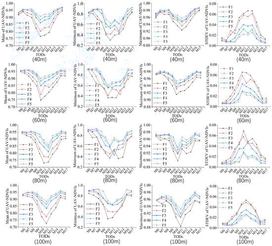 Mean, minimum, maximum and standard deviation of the UAV–NDVIs shown for different zones (F1–F5), times of day (TODs; M6–M17) and flight altitudes (FAs; 40, 60, 80 and 100 m).