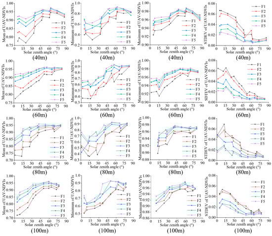 Mean, minimum, maximum and standard deviation of the UAV–NDVIs shown for different zones (F1–F5), solar zenith angles and flight altitudes (40, 60, 80 and 100 m).