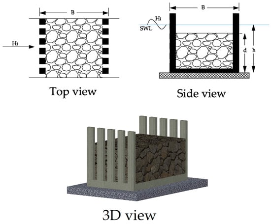 To solve the problems mentioned above, permeable breakwaters were introduced []. Although these types of breakwaters have a lower degree of protection compared to traditional breakwaters, their main advantage is to reduce the volume of materials and the structural problems of previous breakwaters. Also, these breakwaters cause the reduction of environmental problems and further increase the quality of water in ports []. The hydrodynamic performance of these breakwaters is measured based on wave reflection and transmission, which are expressed as coefficients of reflection and wave transmission []. In the following study, we have attempted to introduce an innovative hydrodynamic permeable breakwater behavior as a solution to improve the performance of the generation of this breakwater through lab experience. The introduced permeable breakwater is a two-layer vertical permeable type filled with high porosity rockfill materials (Figure 1). These materials change the flow patterns, and if used in the right way, could play a significant role in energy absorption and reduction of the transmission coefficient, which leads to the improvement of the level of protection and reliability of this type of breakwater, in addition to the advantages of the common permeable breakwater. This new type of permeable breakwater has many applications and can be used as a main or secondary breakwater and loading or unloading jetty. Also, it could be applied in different seabed conditions such as coastal slopes as well as various types of soil. In this study, the front permeable panel has a constant value of 50% permeability, and the rear panel permeability is variable.