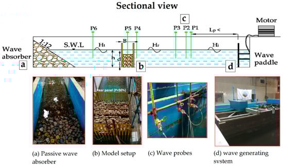 The flume has 32.5 m long, 5.5 m wide, and 1-m depth that was equipped with a DHI wavemaker system. A pedal wavemaker is located at one end of the flume, and the other end of the flume contains a passive wave absorber in the shape of a porous beach, consisting of a 1:12 slope rock ramp to absorb energy and prevent reflection. The piston-generating pedal allows the generation of irregular waves perpendicular to the structure with proper steepness and different periods. Irregular waves have been used to reach the sea conditions, and the impact wave spectrum in experiments is the modified JONSWAP wave spectrum. Figure 2 shows the details of the experimental setup.