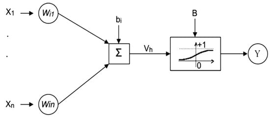 The MLP network consists of an input and output layer and at least one hidden layer. Each of these layers has several neurons and contains the processing unit (s), and each unit is fully connected to the next layer units by a weighted connection (Wij) []. The Y output is obtained by transferring the sum of the previous outputs and mapping by an activation function. Figure 3 basically illustrates the multilayer perceptron neural network. In this figure, Xi represents the inputs, and b/B represents the bias between the different layers. For complex and nonlinear problems, the hyperbolic tangent function or the sigmoid (or log-sigmoid) function can be used.